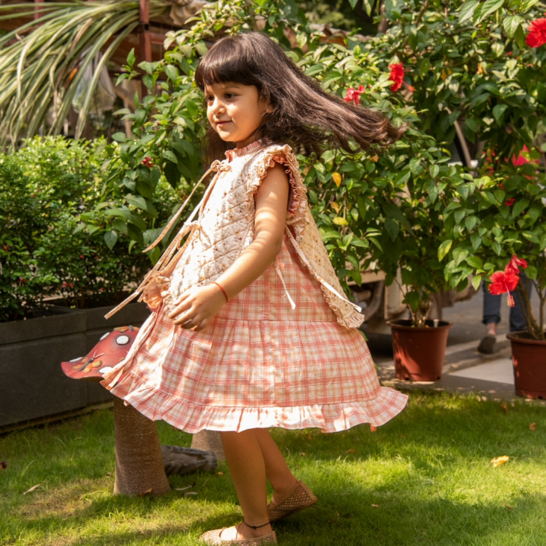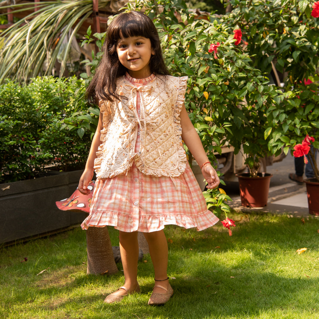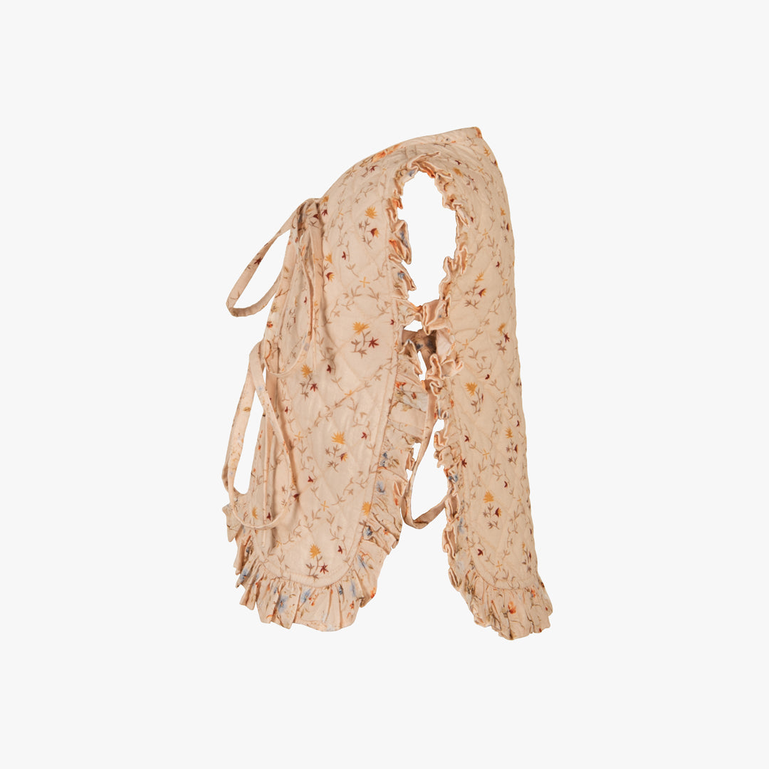 The Ira Floral Vest is lightly padded and quilted in soft cotton with an all-over floral print. Designed with a sleeveless silhouette, delicate ruffled edges, and front tie-up detailing, it blends comfort with charm. Perfect for layering over dresses or tops, this vest adds a touch of warmth and playfulness to any outfit.