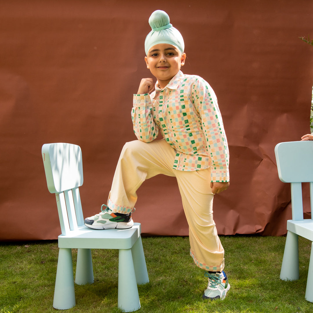 The Kavi Shirt is crafted from soft, breathable cotton cambric, designed for everyday comfort and easy movement. Featuring colourful checks in pastel hues of blush, sage, and sky blue, it adds a cheerful and modern twist to classic shirting. Detailed with a smart collar, button-down front, and full sleeves with cuffs, perfect for both boys and girls to wear through every season