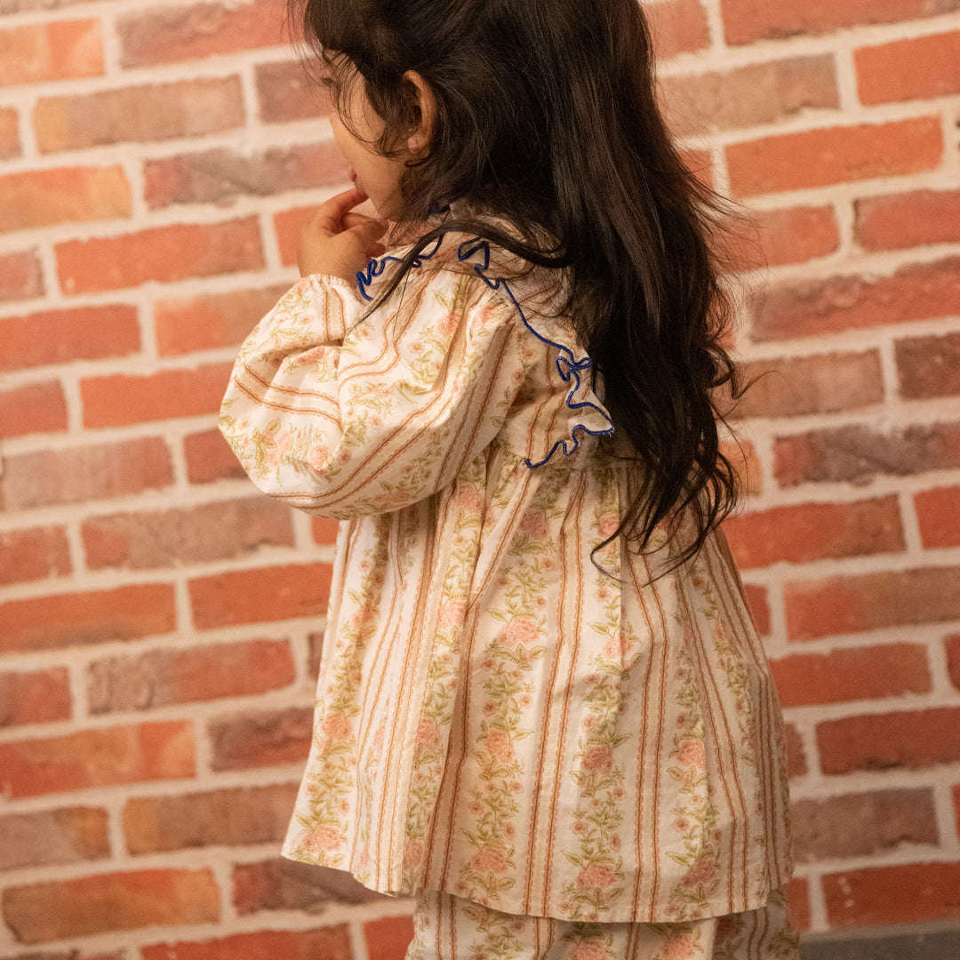 The top is detailed with a gentle gathered yoke, subtle frill accents, and a comfortable silhouette that allows easy movement, while the elasticated waistband pants ensure all-day comfort and fuss-free wear. The floral stripe print, inspired by old-world charm and slow living, adds a timeless, playful feel to the set.