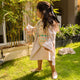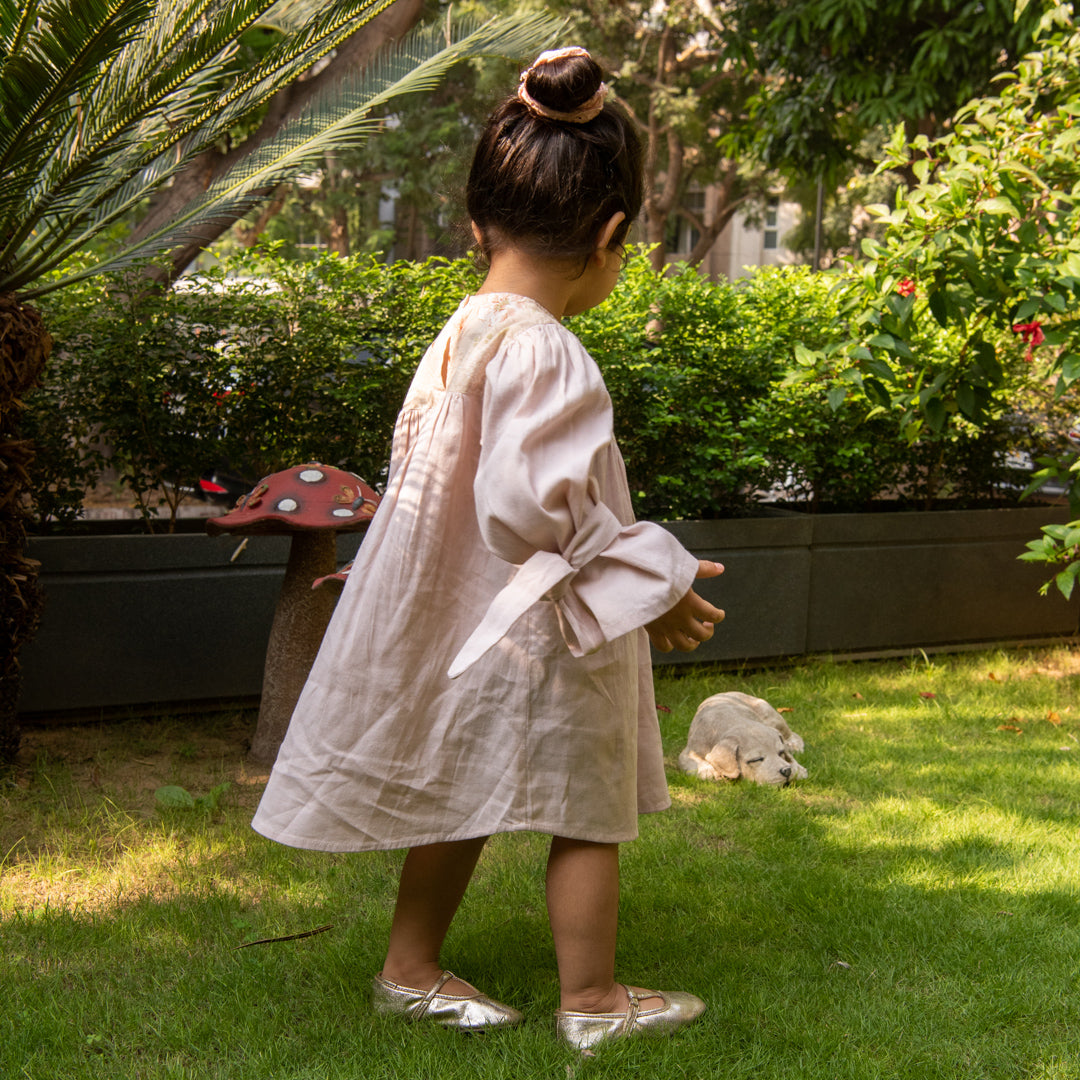 The Lea Dress is made from breathable cotton, featuring a floral printed yoke and soft gathers for ease and comfort. With flowy sleeves and side ties, it offers a relaxed fit for all-day wear. A simple, elegant cotton dress designed for comfort, play, and timeless charm.