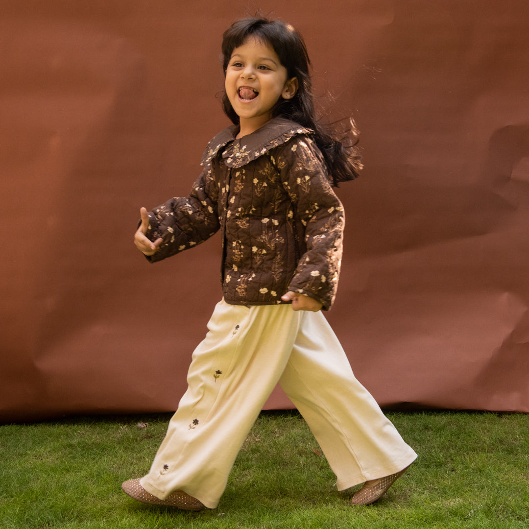 The Theia Jacket is crafted from soft cotton with delicate quilting for warmth and comfort. Featuring an all-over floral print and a contrast Peter Pan collar with ruffle details, it blends traditional charm with everyday style. Thoughtfully designed for cozy days.