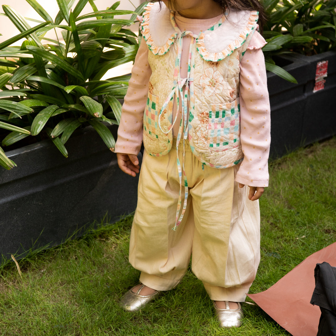 The Zyra Vest is quilted in soft woven cotton, designed with a frilled Peter Pan collar and a front tie-up closure for easy wear. Featuring colorful block print patch pockets and delicate piping along the borders. Perfect for layering over dresses or tops, this vest adds a playful touch while keeping little ones cozy and comfortable.